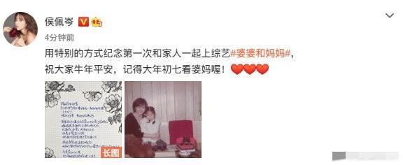 在同一天42岁的侯佩岑也在社交平台上发文宣布了自己和妈妈参加综艺节目录制的消息,在晒出的手写信中侯佩岑称母亲已经71岁,岁月流逝猝不及防,但是它带不走珍贵的回忆。而这次她要带着自己最爱的家人踏上新的旅程。