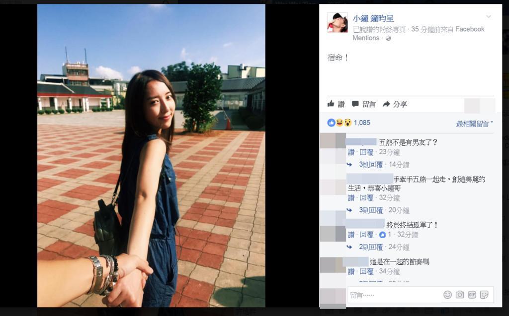小钟21日在脸书PO出一张五熊的回眸照,画面中他牵着女方的手,五熊则是露出甜甜一笑,周遭散发甜蜜氛围,加上先前他曾在节目上表白,大赞五熊是个很好的女生,却因为对方有男友不便追求,没想到当时刚分手的五熊却大方回答:「我现在没有男朋友啊!」