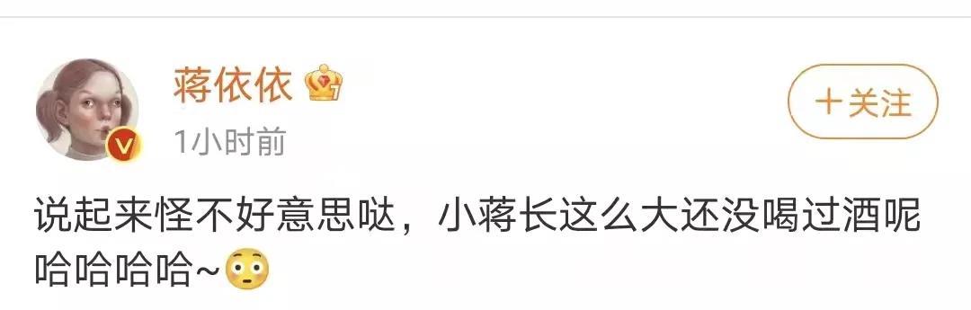 然而,刚刚蒋依依发文:“说起来怪不好意思哒,小蒋长这么大还没喝过酒呢哈哈哈哈~”否认与郭麒麟恋爱。