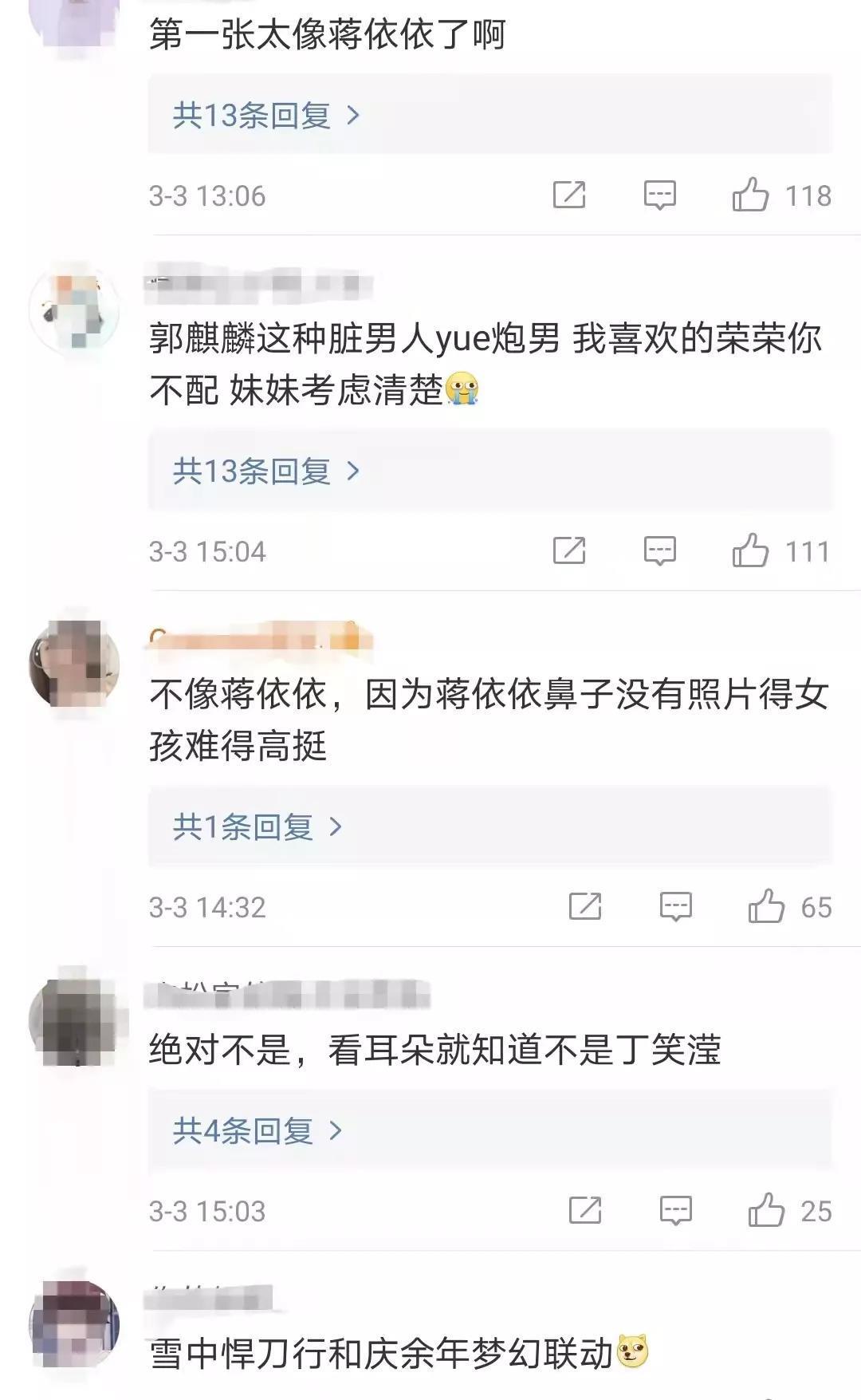 3月3日,有八卦媒体曝光了郭麒麟和女子酒后在街头亲吻的画面,有网友看照片猜测是蒋依依,#郭麒麟蒋依依# 引发热议。