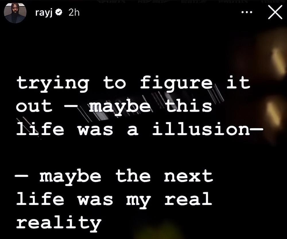 近日,Ray J在其Instagram社交媒体上发帖表达了自杀的想法,并质疑生活是一种“幻觉”。该帖标题为“如果不是因为孩子,今晚我就会从这跳下去死。”他还配了一段自己身处离地面很高的位置的视频。Ray J还谈到了自己的生活,他说“正在试图弄清真相——也许这是一个幻觉。”他还说“下一段生活就是我的真实生活。”