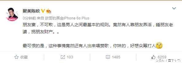最近,聚美优品的ceo陈欧可以说是非常活跃,总能冒出金句,点评娱乐圈的是是非非,王宝强和马蓉的纠葛,似乎也让陈总义愤难平,8月17日晚,陈欧又在微博中感慨:“朋友妻,不可欺,这是男人之间最基本的规则。”接着又似乎有所影射,“竟然有人靠朋友养活,睡朋友老婆,拐朋友财产。”对于这些另陈总所不齿的事,居然有人唱赞歌,陈总自然不爽,陈总再吐金句:“好想众筹打人”。