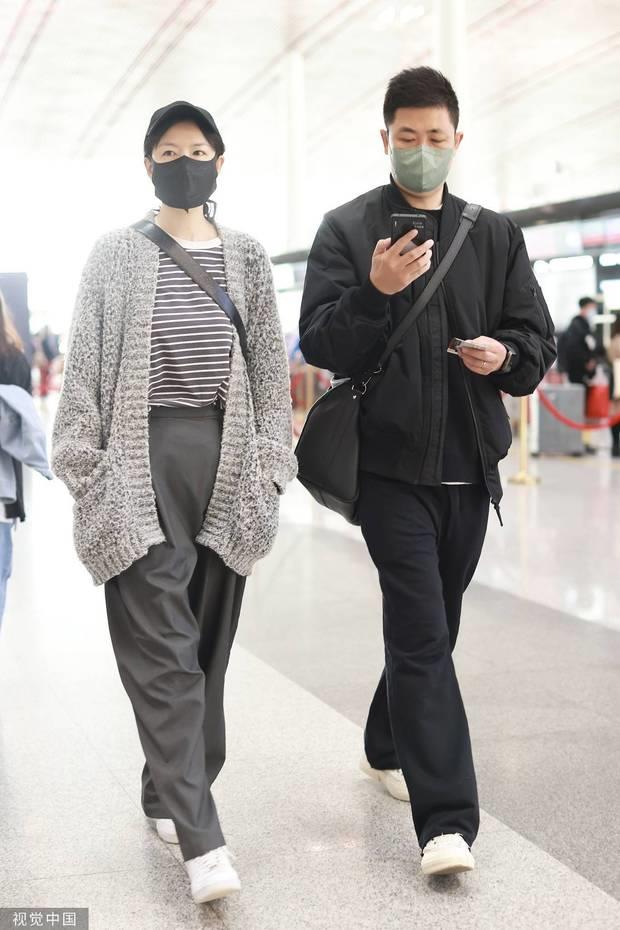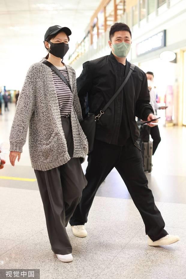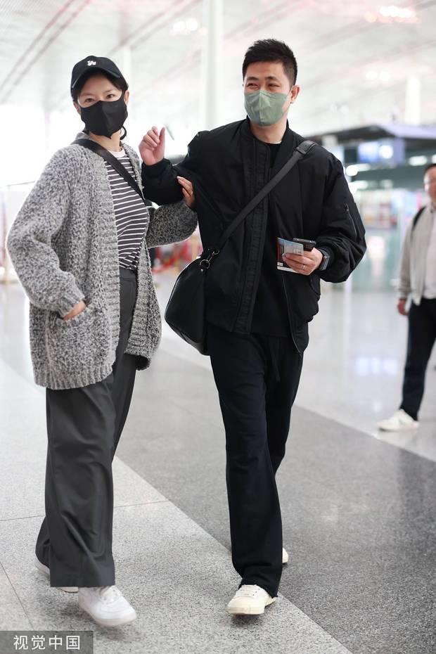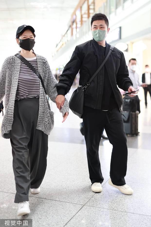 李艾与老公张徐宁牵手现身机场 穿着休闲互动甜蜜