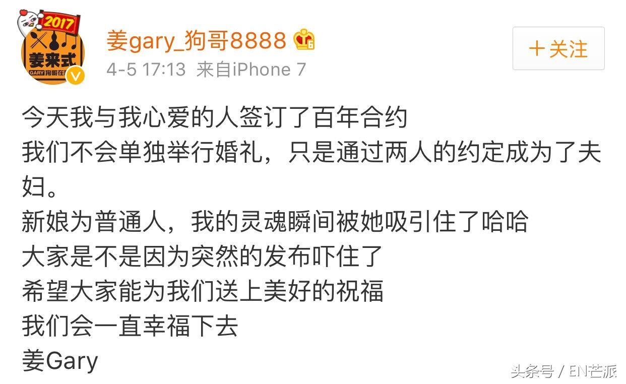 昨日(5日),姜Gary在微博上承认自己已经领证准备结婚,女方为普通人。