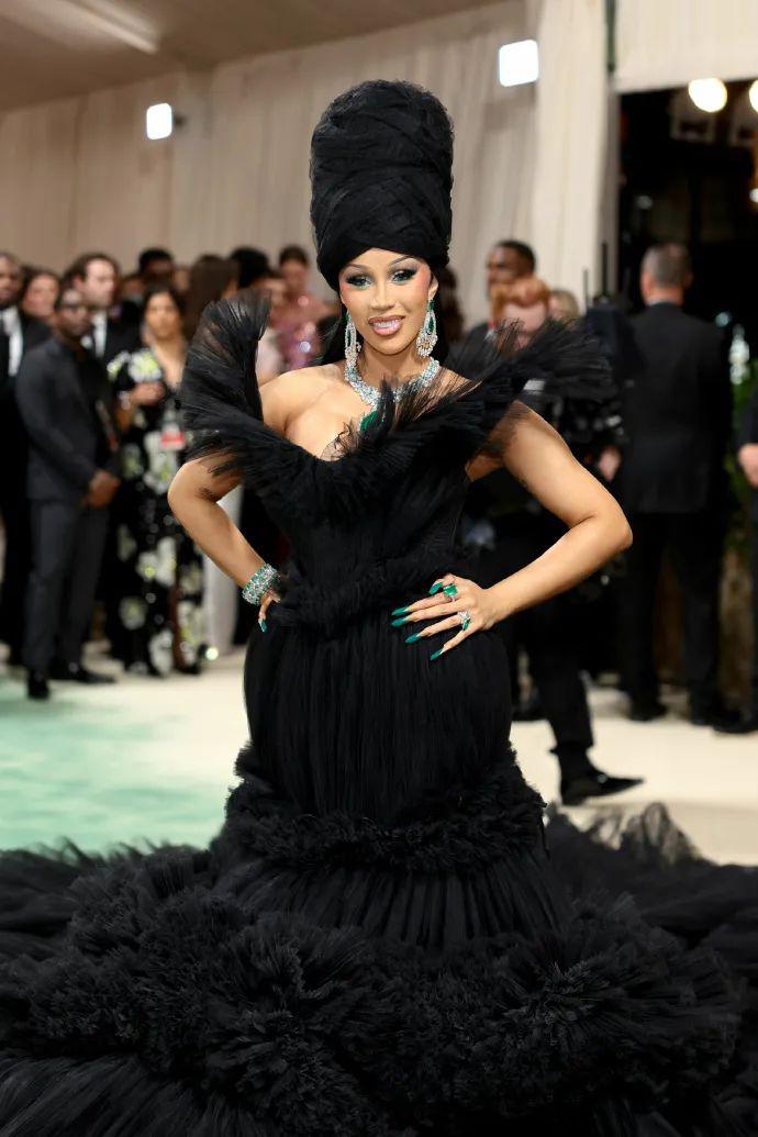 卡迪比主要靠面积取胜,大面积的黑配绿色珠宝,是豪横的美艳寡妇没错了。