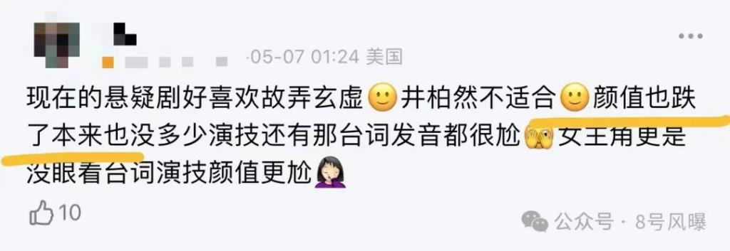 有观众认为周依然本身是挺有灵气的演员,但是在剧里的台词又木又干,很像剧本杀中 cue 流程的 mc。