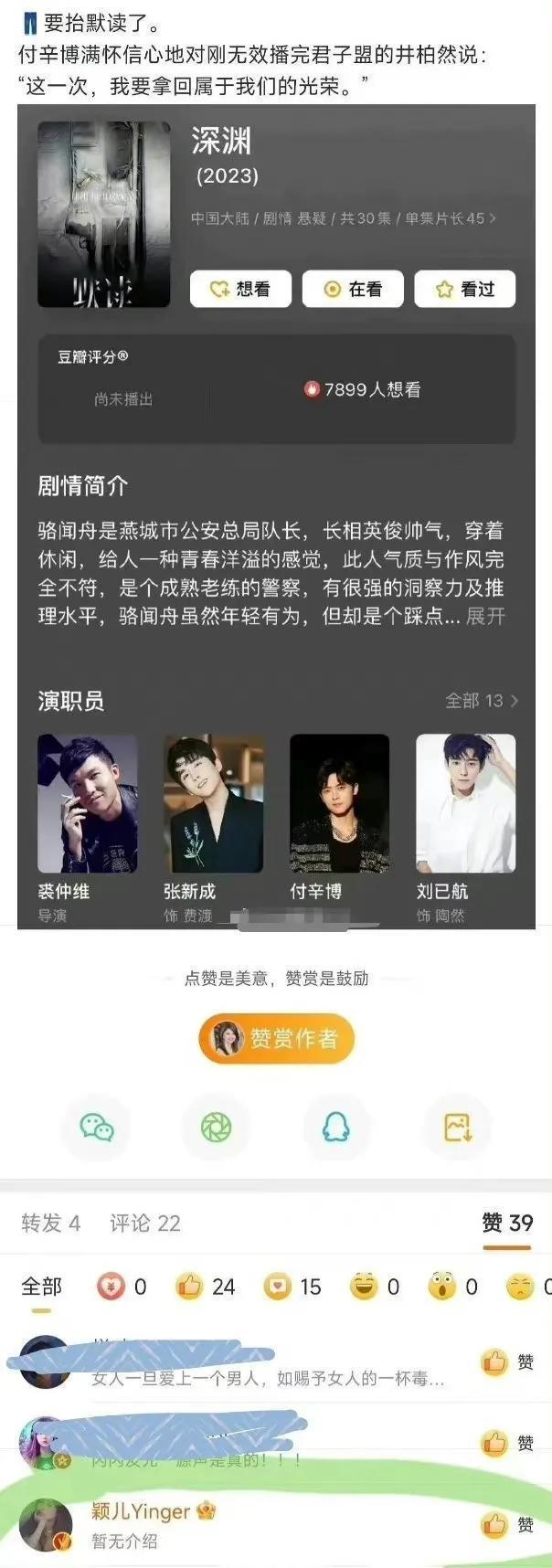 付辛博拍的《默读》也改名为《深渊》,目前待播出,付的老婆颖儿点赞了相关内容,看来是要播了[狗头]。在此呼吁优酷早点抬上来吧,让小喵审判一二。[送心][送心][送心]