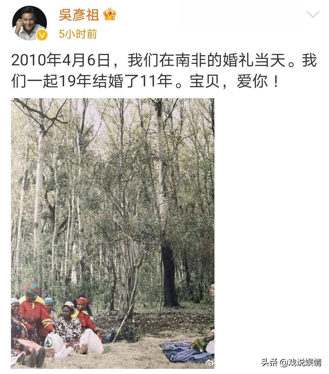 4月8日凌晨,吴彦祖发文庆祝结婚11周年同时也是在一起19周年,并且表白老婆:“宝贝,爱你!”