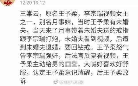 当年王予柔可是李宗瑞事件最为知名的女主之一,因为她和李宗瑞两人行男女之事时,王予柔正值生理期,并且当时的王予柔已经和男友订婚。后来视频在网络疯传后,男友悔婚,王予柔控告李宗瑞性侵。