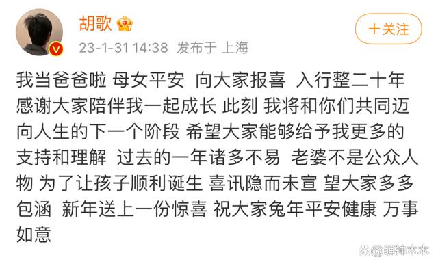 1 月末的大瓜,没想到是胡歌给的。1 月 31 日下午,胡歌发文官宣当爸,母女平安,妻子是圈外人士,为了让孩子顺利诞生,喜讯隐而未宣,新年送上一份惊喜,祝大家兔年平安健康。满屏的幸福之情,瞬间刷爆热搜。