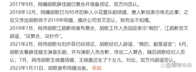 纵观胡歌近些年的 " 感情史 ",从 2006 年胡歌与薛佳凝恋爱,2009 年和平分手。再到 2014 年胡歌官宣与江疏影恋情,2015 年江疏影与胡歌分手。后来又经历了各种复合领证被辟谣的消息,什么胡歌薛佳凝已复合并准备领证双方辟谣;胡歌与章乐韵结婚被公司辟谣;与江疏影复合双方辟谣;与刘亦菲领证经纪人辟谣;与王晓晨结婚生女辟谣。总之,不是在辟谣就是在辟谣的路上,但或许就在这期间,胡歌闷声结了婚。
