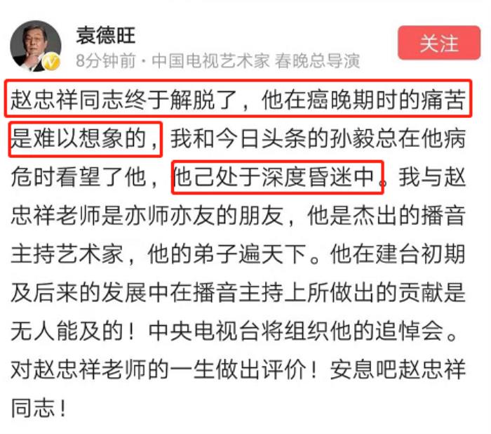 袁德旺称赵忠祥在癌症时期的痛苦是难以想象的,自己去看的时候,赵忠祥已经陷入了深度昏迷,甚至说了“他终于解脱了”这句话,足以证明赵忠祥患癌之后有多难受。