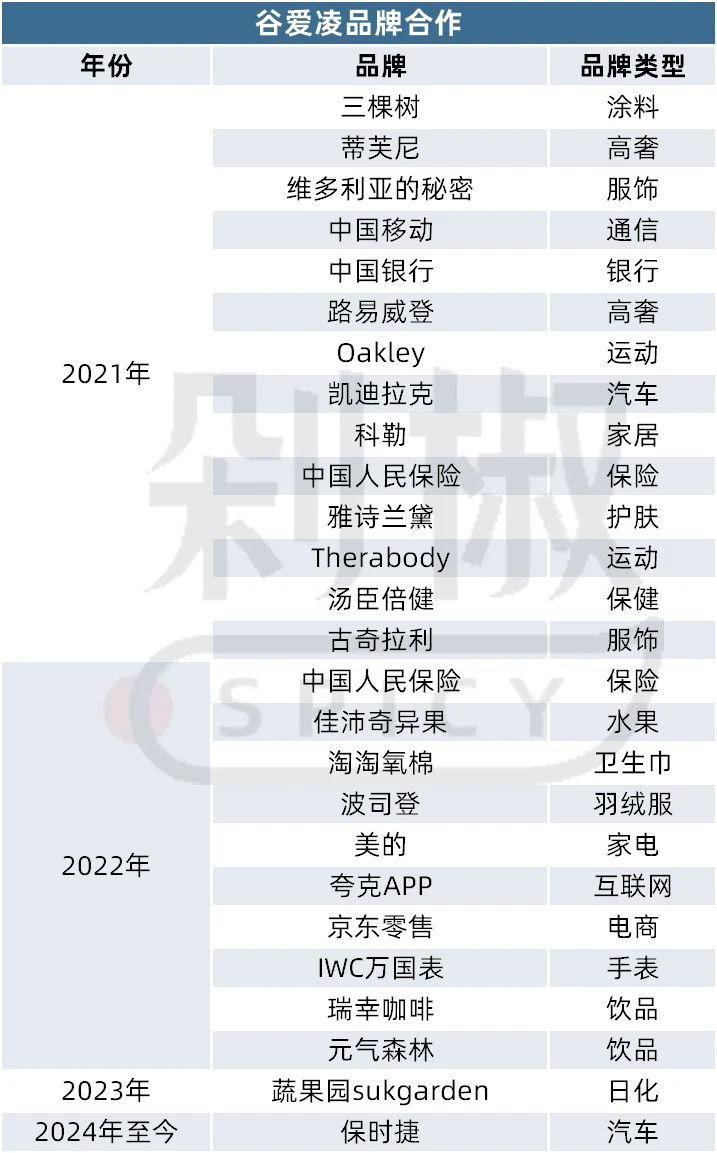 再将谷爱凌的品牌代言以时间轴纵向延展开来,可以发现,与冬奥会前后密集官宣一线品牌相比,随着冬奥会热度渐退,谷爱凌在高奢品牌的拓展能力上有所下降。2025 年,谷爱凌甚至不得不降低品牌门槛,与蔬果园为代表的生活家居类品牌进行合作。