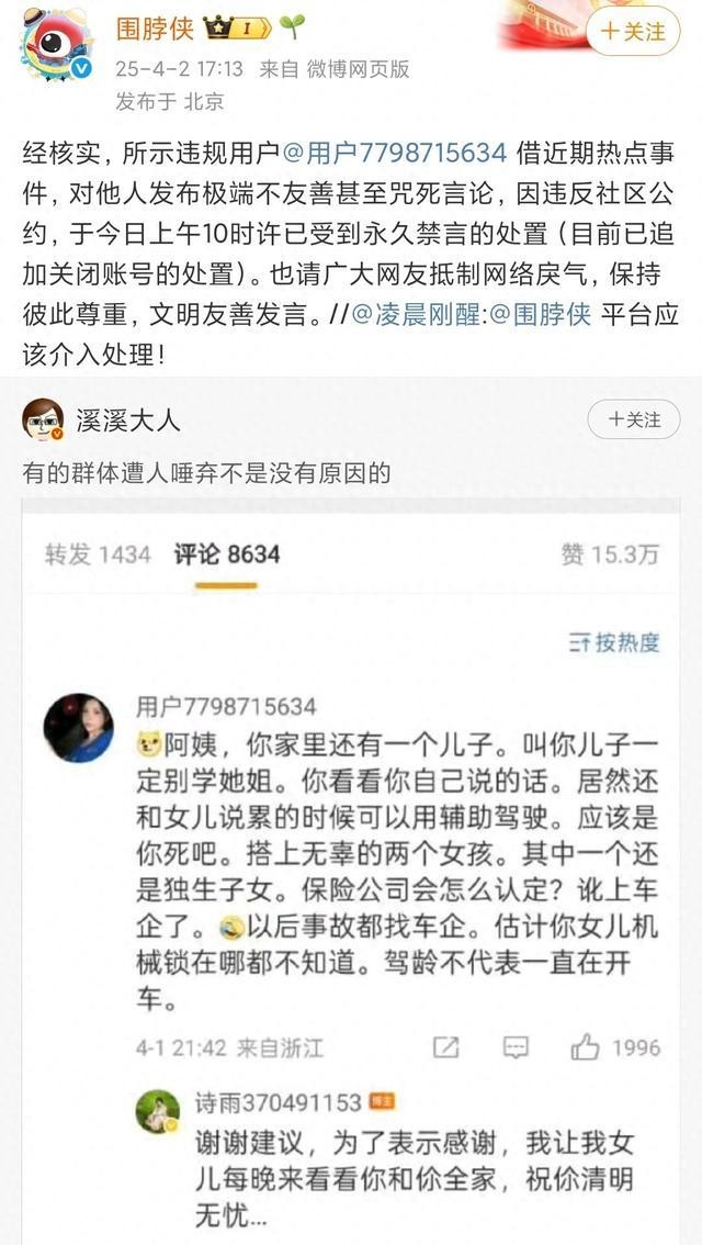 微博用户7798715634因借小米SU7事故对遇难者家属发布极端不友善言论,被永久禁言并关闭账号。据悉,被针对的“诗雨370491153”微博用户认证为遇难者家属王女士,其与事故相关内容已删除。