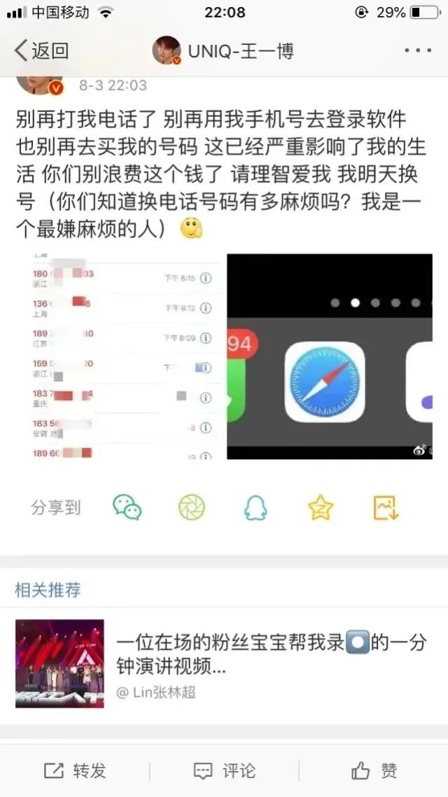 原来王一博的个人信息被泄露,手机号在各个平台进行转卖,转卖价格高达上万元,而王一博每天接到无数个粉丝的电话,电话中粉丝疯狂表示对他的喜欢!甚至凌晨也不停歇,个人生活严重被打扰。王一博本人也实在是没有办法了,就发了一篇微博,请求粉丝不要再打扰他了,呼吁粉丝理智一点!