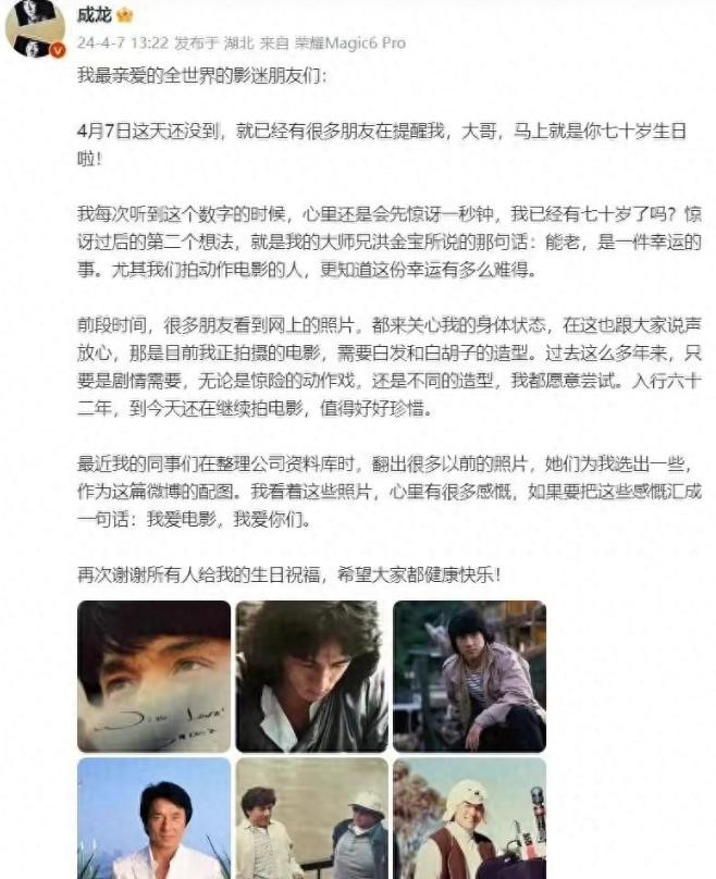 成龙,这位在影坛摸爬滚打了六十二年的传奇人物,在他的七十岁寿宴上,再次成为了众人瞩目的焦点。早在寿宴前夕,成龙就在微博上发布了一篇感谢文,透露自己已经提前收到了众多的祝福。这不仅仅是一份简单的感谢,更是他六十二年演艺生涯的见证。