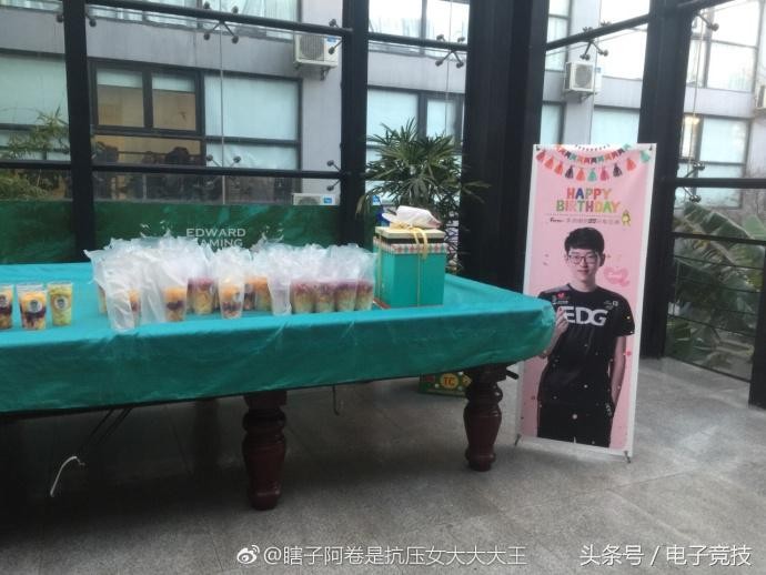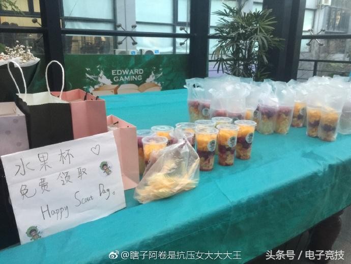 昨天,是英雄联盟战队EDG的中单选手Scout的生日。粉丝们自发购买了蛋糕、礼物、零食等生日礼物送到了EDG的基地门口,并免费赠送水果杯。