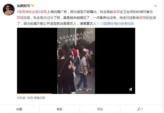 近日,李现现身上海拍摄广告,因为造型不能曝光,工作人员拿黑伞遮住了李现。现场部分粉丝因未见到李现而破口大骂,据现场知情者称,有私生饭趁李现上厕所的时候对着李现骂脏话,直接大喊“50万芭莎是谁给你买的”。