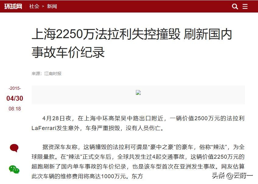 而在2015年4月,一辆价值2500万元的法拉利LaFerrari在上海的一场暴雨中出了意外,驾车的人虽然没受伤,但这辆豪车中的豪车却损毁相当眼中,据估算仅维修费都得一千万。