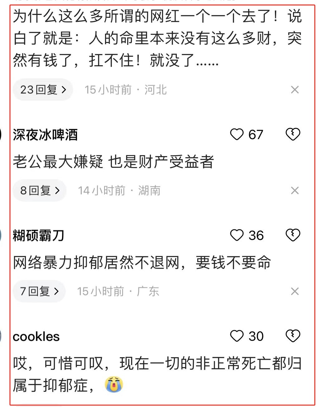 又不是没条件,经济条件那么好,退出网络的纷纷扰扰,安安静静过小日子,肯定就不会发生悲剧。