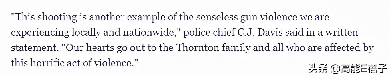 警察局长戴维斯在一份书面声明中说:“这起枪击事件是我们在当地和全国范围内所经历的毫无意义的枪支暴力的又一个例子。”“我们向桑顿一家和所有受到这一可怕暴力行为影响的人表示同情。”