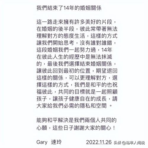11月26号,吴速玲与曹格分别在社交网上官宣离婚消息。文案中提及两人在婚姻的前半段时间里,一直相亲相爱,从没有发生过巨大的矛盾,但婚姻的后半段,却因为彼此无法理解对方的生活,从而产生分歧,最终导致离婚。