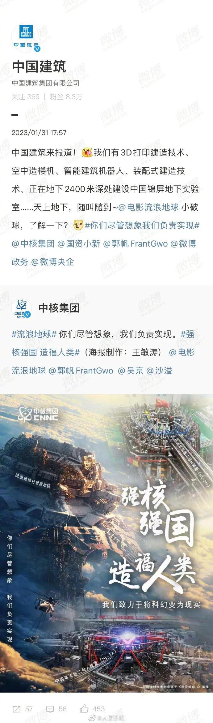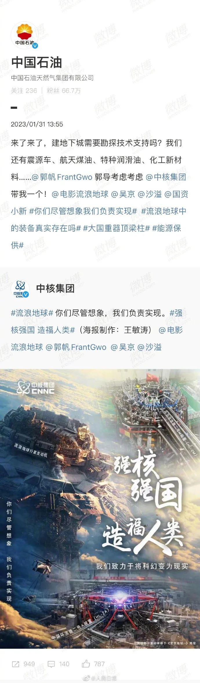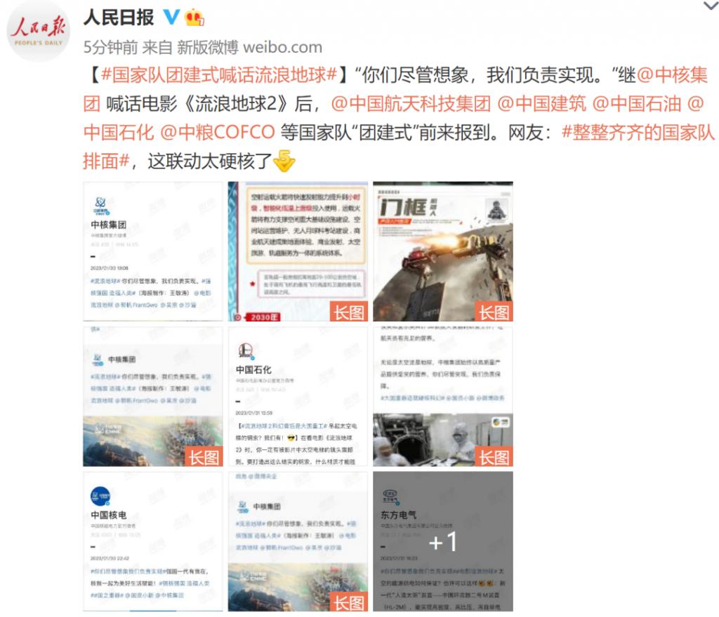 " 你们尽管想象,我们负责实现。" 继中核集团喊话电影《流浪地球 2》后,中国航天科技集团、中国建筑、中国石油、中国石化、中粮集团等国家队 " 团建式 " 前来报到。网友:整整齐齐的国家队排面,这联动太硬核了!