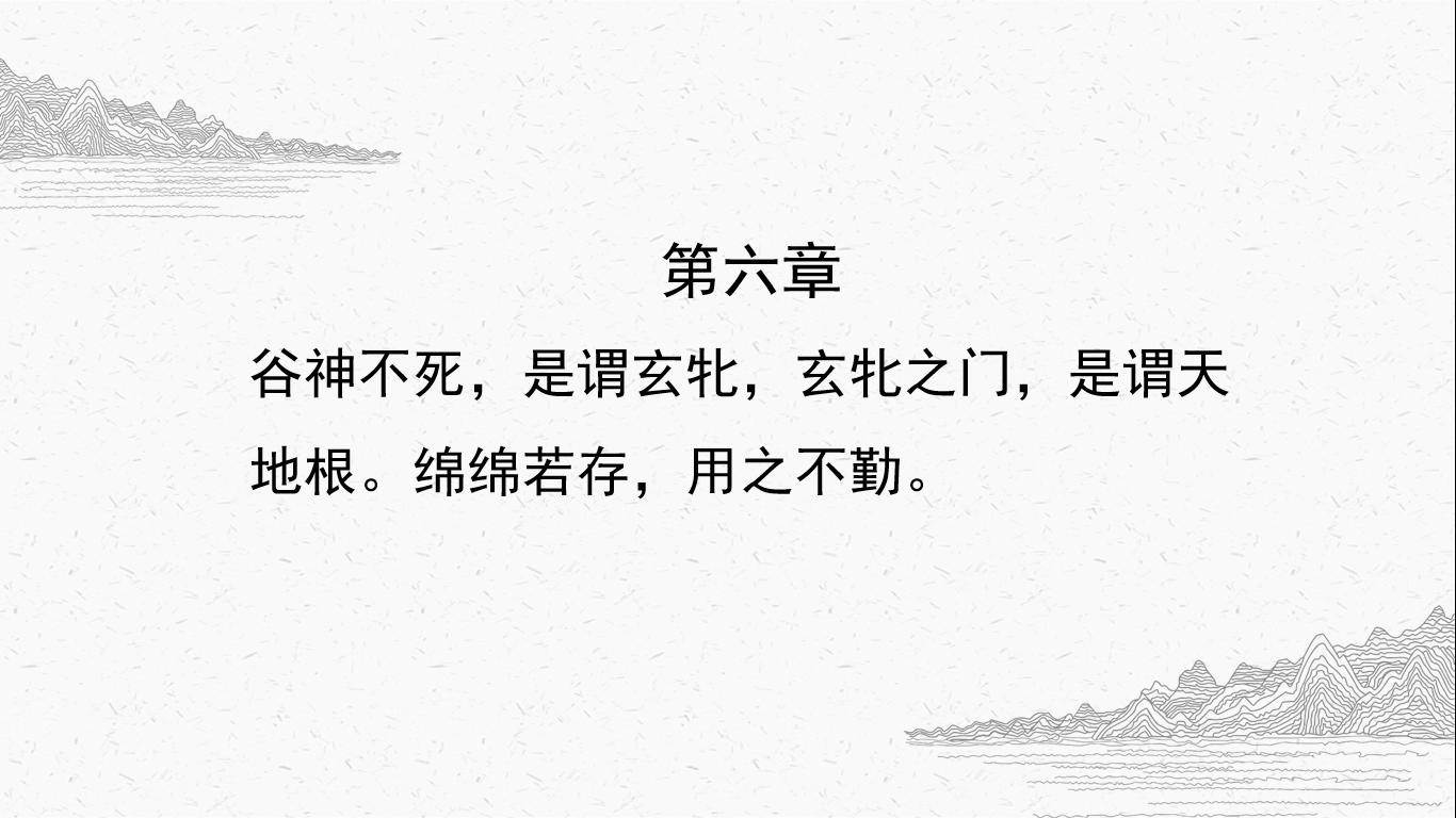 所以这一章的前面这一句话,谷神不死,是谓玄牝,玄牝之门,是谓天地根。是对前文章节道体生育万物这一个特性作出的一个总结。