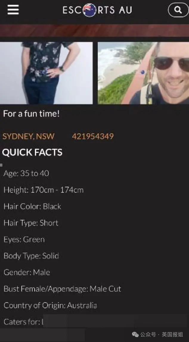 他在自我介绍中自称为一位居住在悉尼的 "39 岁的运动型英俊男子 ",并声称自己可以提供数十项性服务。