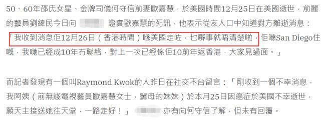 据悉她于美国时间12月25日逝世,刘纬民从好友处得知欧嘉慧离世消息,其他的详情也不清楚,10年前欧嘉慧返港他们见过面,有10年没有联络,突然得知这个消息,还是希望她一路走好。