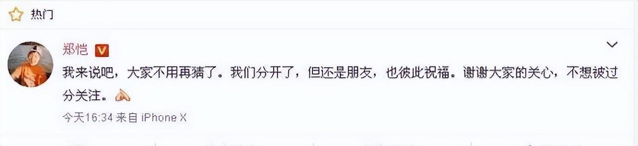 然而这件事仅过去了一个月,郑恺就在社交平台官宣两人已经分手的消息,让很多看好这对情侣的网友分外遗憾。