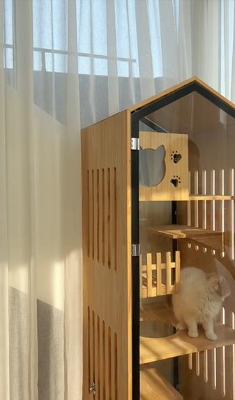 程晓玥还在家中养了一猫一狗,猫咪的窝是一个“小玻璃豪宅”,程晓玥把它安置在了二楼的阳光房中。