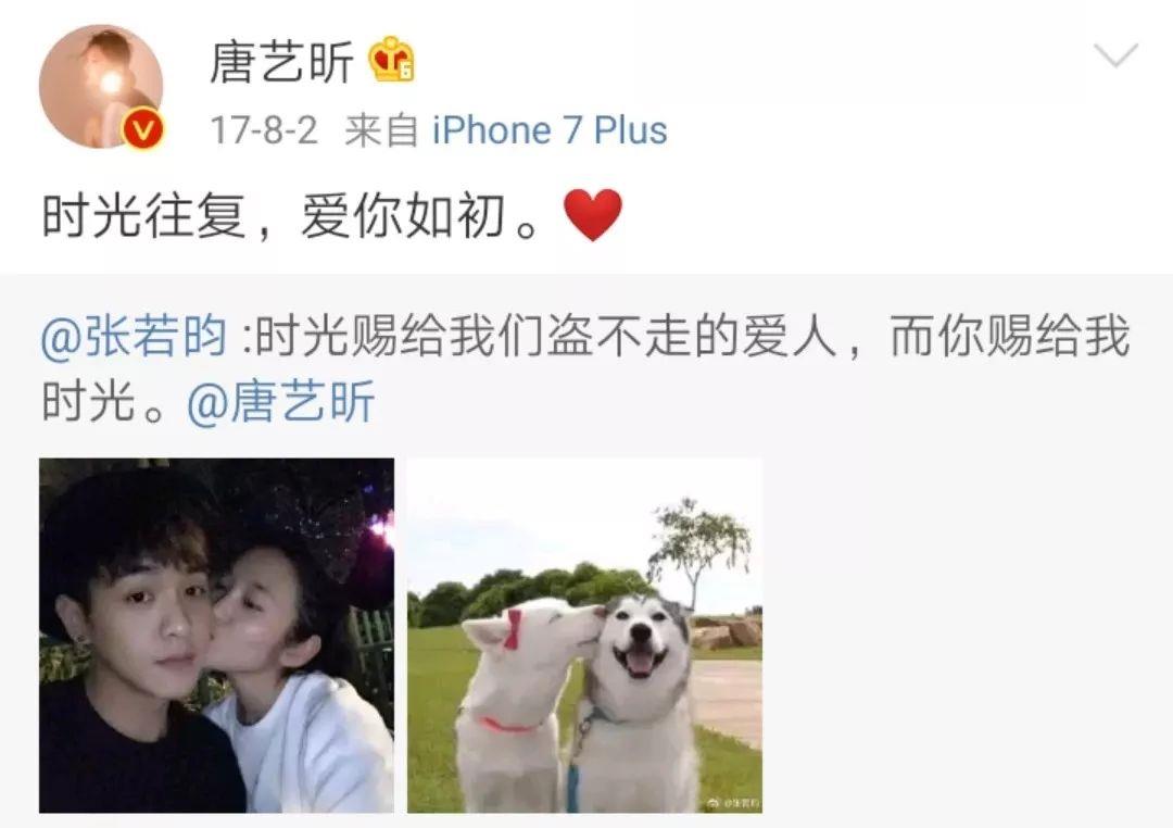 唐艺昕原名叫唐婷,后来改名叫唐艺昕,跟张若昀的名字一样,一个草字头、一个日字旁,两人连名字都是情侣款; 他们还分别养了“情侣狗”,一只叫皮特,一直叫屁颠,狗的名字也是情侣款,就……行吧(单身狗落下泪来); 两个人在脚踝处纹了同款纹身,唐艺昕纹的是“Love Life as Love you”,而张若昀的是“Love you as Love Life”,像极了王小波写给李银河的情话,爱你就像爱生命一样;