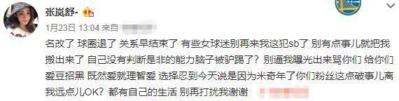 对此,张子珂为了避免不必要的麻烦还特意改了名,现在的她叫“张岚舒”。今年年初她还发文怒怼那些看热闹骚扰她的网友,表示现在已改名,也退了球圈,和赵睿结束了恋爱关系,自己不想再被影响生活了。的确,网上各类窥探个人私生活的恶性行为让人不齿。