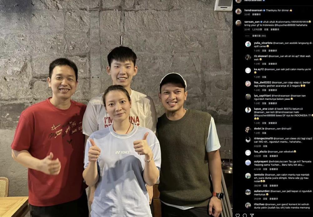 从照片可以看到,刘雨辰站在黄雅琼身后,两人看起来十分甜蜜般配。亨德拉先是在社交媒体留言称“谢谢你们请我们吃饭。”随后亨德拉的妻子喊话刘雨辰:“把你女朋友带到印尼来。”亨德拉回复妻子调侃打趣刘雨辰和黄雅琼:“他经常带来。”(指刘雨辰、黄雅琼经常一起随国羽前往印尼参加比赛)实际上,据知情人透露,刘雨辰与黄雅琼的恋情在羽毛球职业运动员圈子里已经是公开的“秘密”。