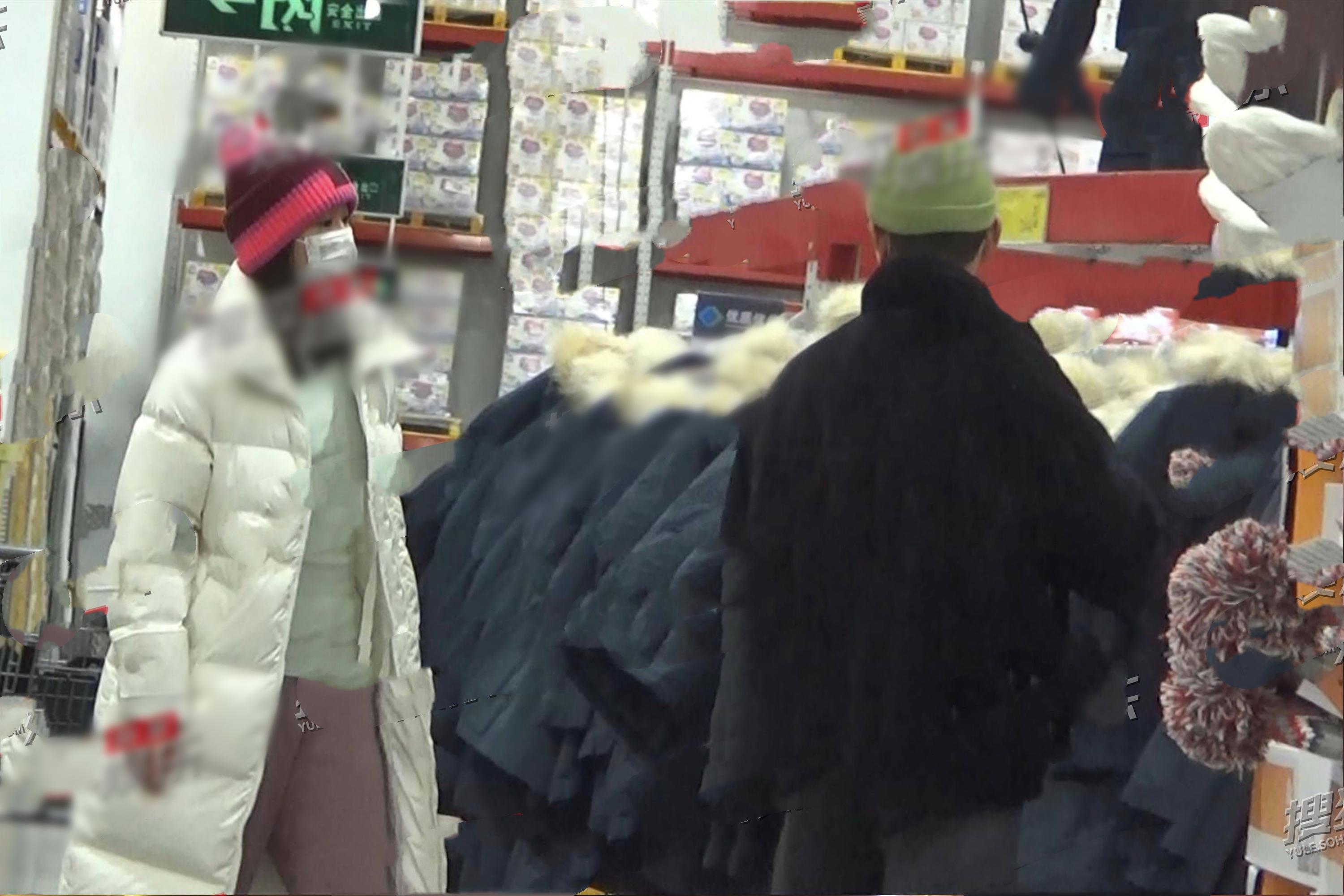 两人购买了很多生活用品后,又来到了服装专区试衣服,最后女方购买了一件黑色外套。