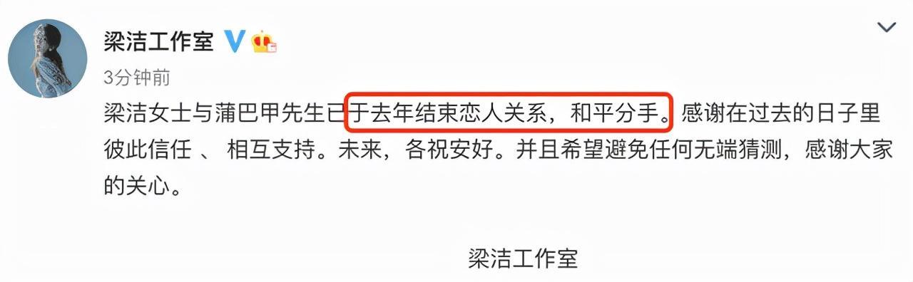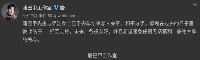 2020年11月,就有网友爆料过蒲巴甲和梁洁已经分手的消息,因为梁洁已经把求婚微博删除,果然网上的传言都不是空穴来风。