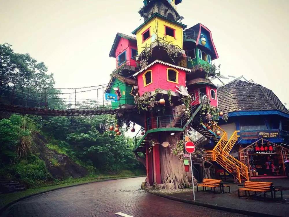 原洋人街的众多“网红建筑”,都将整体搬迁至新址,比如穿楼索道、创意厕所、长城、小火车、游船、马车、树屋、歪楼、教堂、彩色网红S路、洋人街1元馒头等。