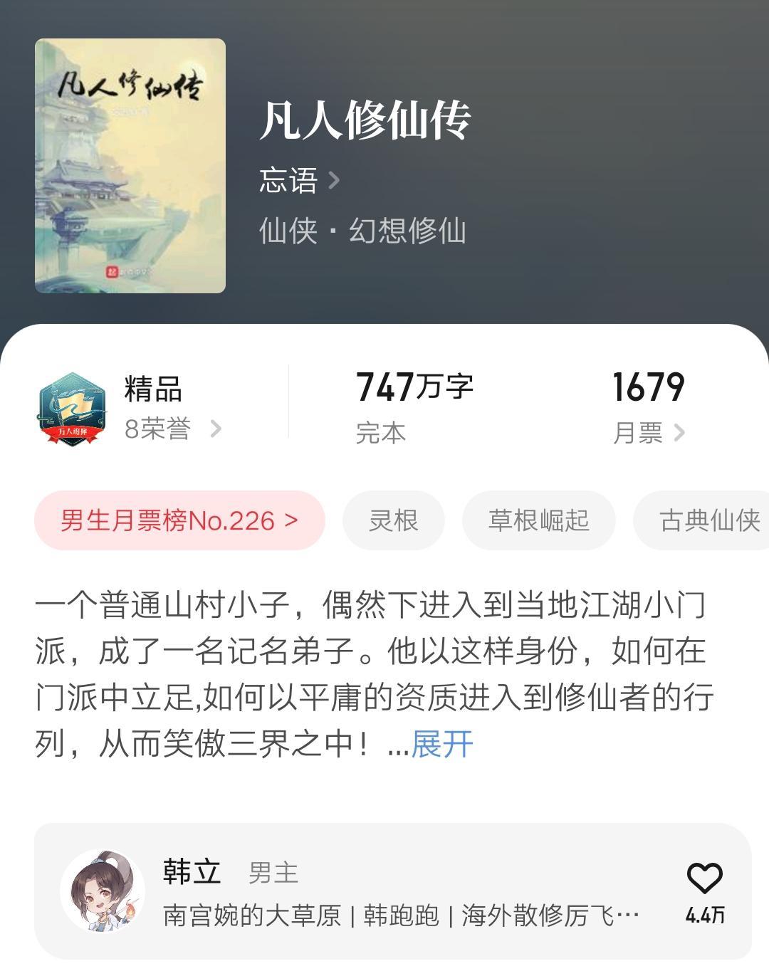 从起步凡人到寻求成为仙者改变命运的故事脉络来看,题材上说它是新一本的“凡人修仙传”应该是没什么问题的,就是能不能再现《凡人修仙传》的口碑和热度那就是另外一回事了。