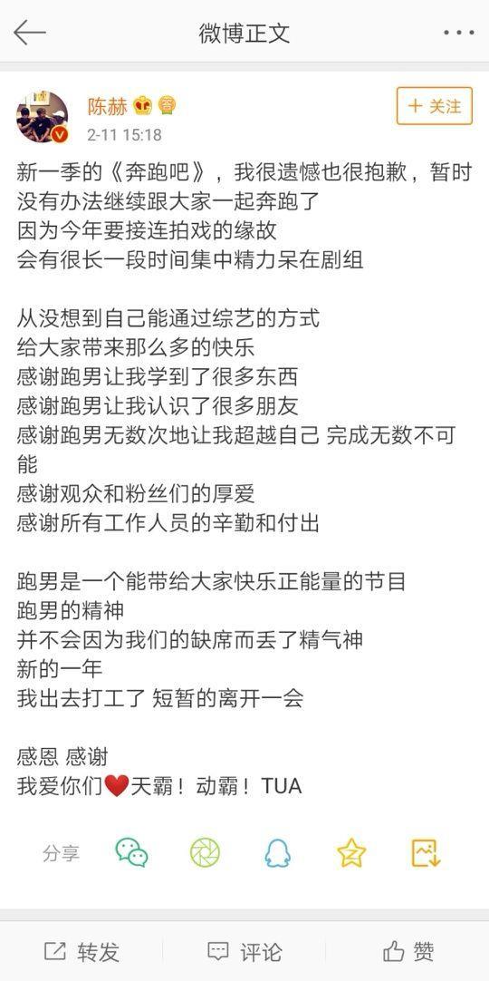 文中我们可以看到,陈赫表达了对跑男的不舍,但又不得不离开的遗憾,最后的天霸!动霸!TUA更看出他对跑男的感情