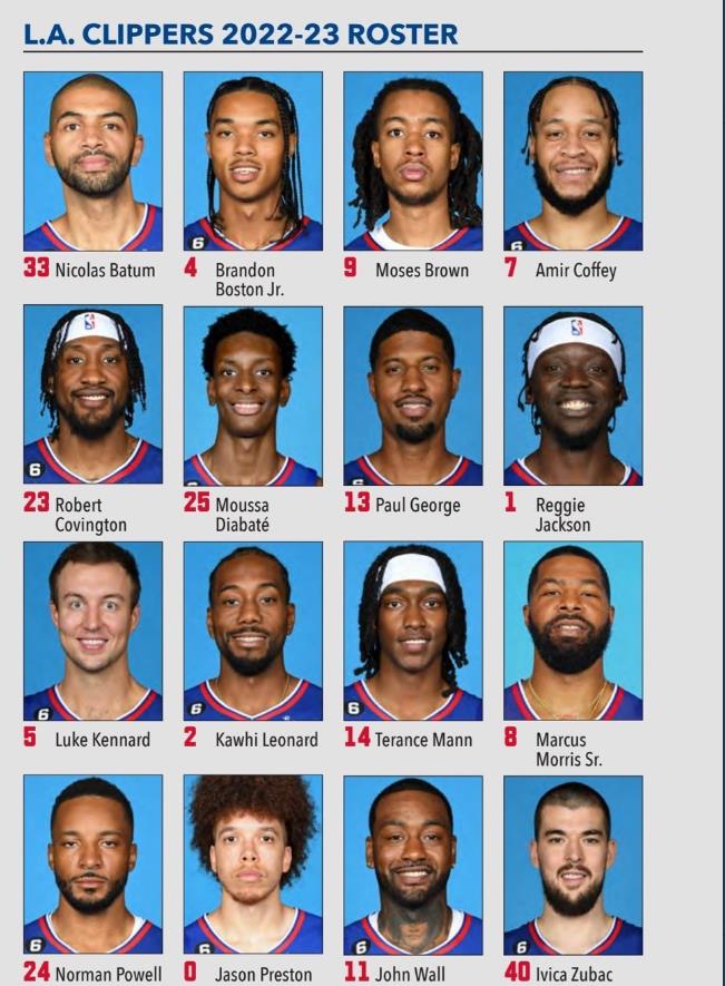 快船的常规赛16人名单出炉,包括2个双向球员,常规赛名单第15人空缺: