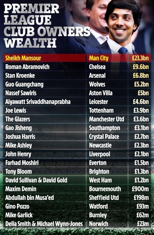 英超球队老板财富排行,仅曼苏尔酋长拥有百亿级别资产