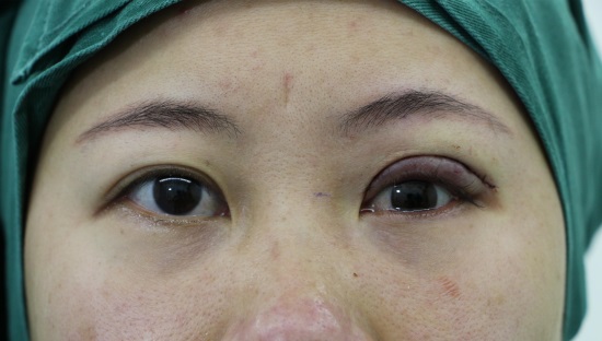 检查双眼肌力大小和双眼皮形态后,给她制定的修复方案是单侧(左眼)上睑下垂修复,术后即刻还是有点肿胀。