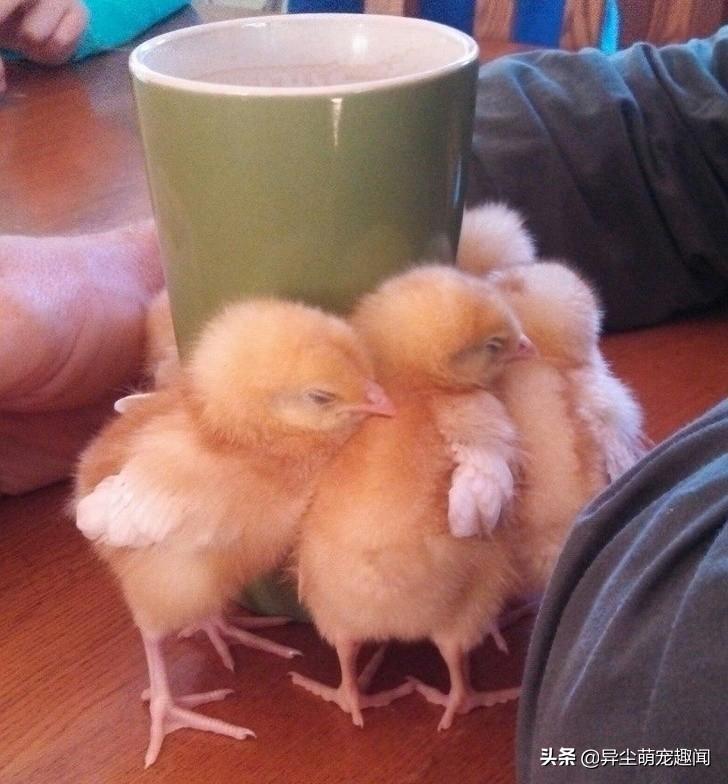 ▼刚刚出生3天的小鸡聚在咖啡杯旁边取暖。