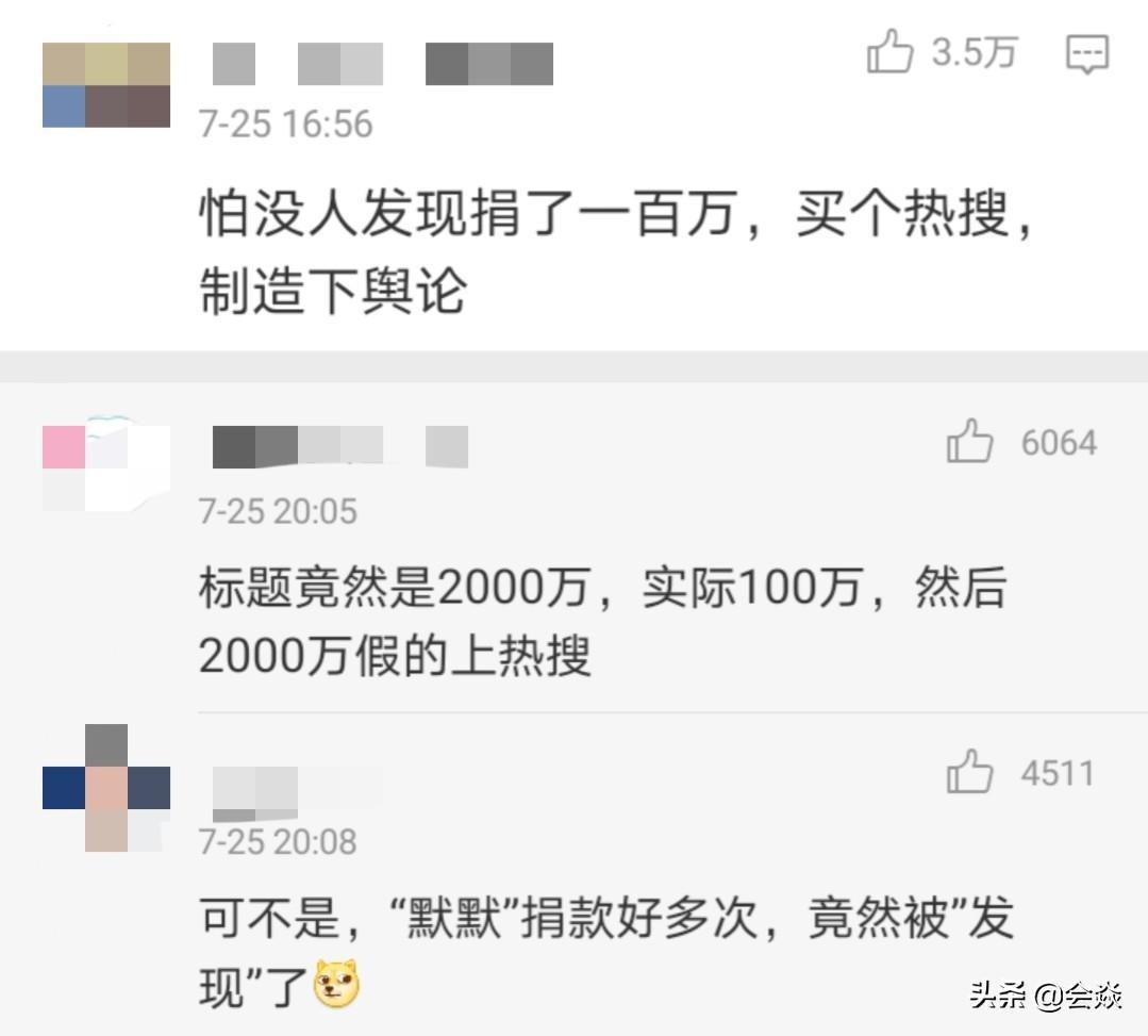 对此,网友纷纷发布质疑:“怕没人发现捐了一百万,买个热搜,制造下舆论”“标题竟然是2000万,实际100万,然后2000万假的上热搜”“可不是,默默捐款好多次,竟然被发现了”。