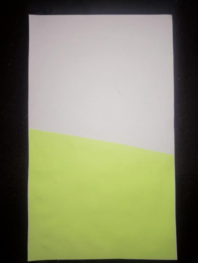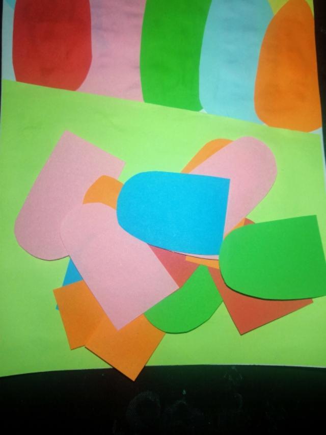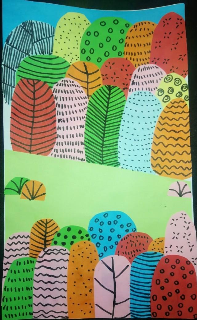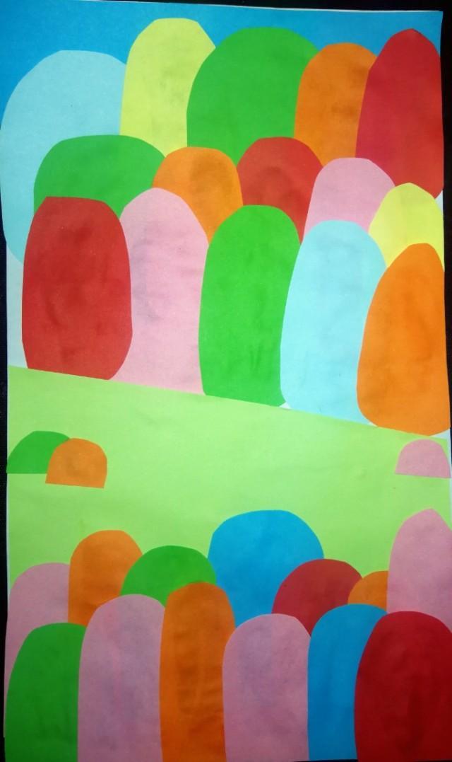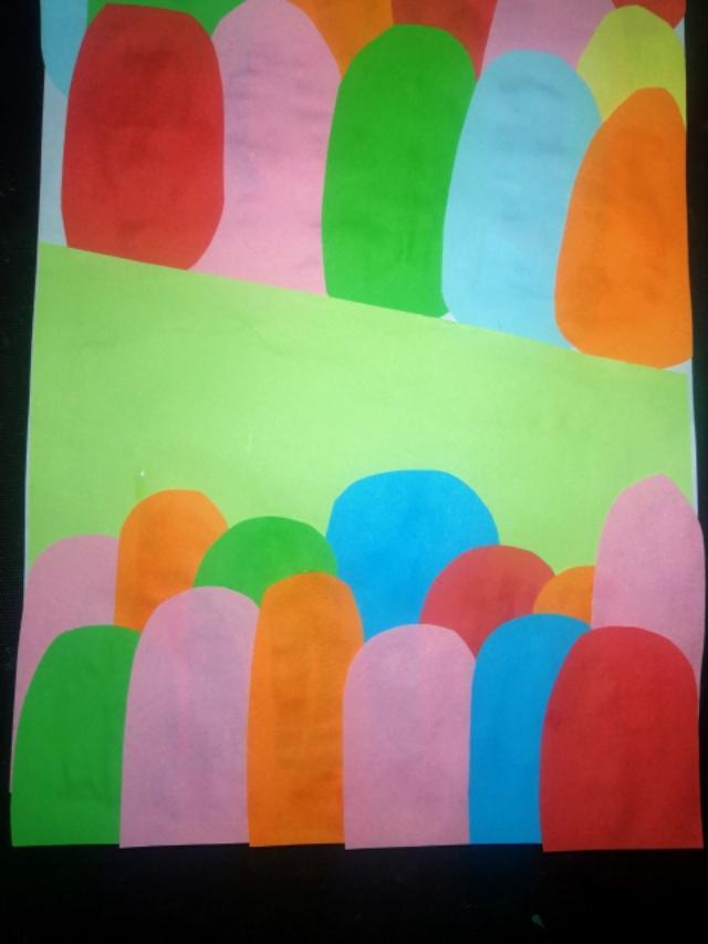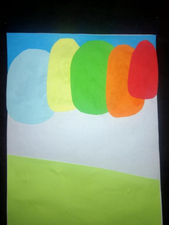 3.剪一些大小不一,颜色各异的不规则的椭圆形状当做树,并从上到下,高低错落,互相遮挡的贴在草地上部分画面中。