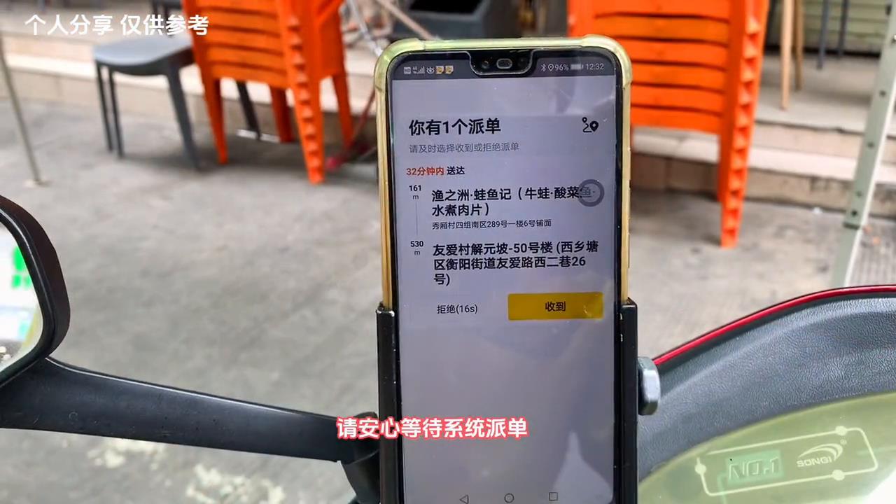 在午高峰时段,我们可以选择在人流量和订单量较多的地方上线等待订单。不要担心也不要紧张,身边的骑手不会真正了解你。展示真实自我,我没有关闭原视频声音。如果你是新手,看到大厅有单也不要去抢,新手期间会派靓单给你,请安心等待系统派单。系统派了一单靓单,我们点击“收到”,然后刷新一下。