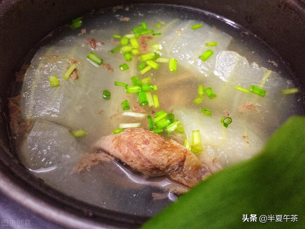 与荷叶搭配的,通常是薏米与冬瓜,肉类可以放瘦肉、猪骨,先将肉类与薏米煲开约一小时左右,放入冬瓜,再煲半小时,新鲜荷叶放入汤中略滚熟即可。此汤汤水清甜,消肿利湿,除暑除烦,喝起来有一股淡淡的荷香味。也是广东人家夏季餐桌最多最常见的汤式。