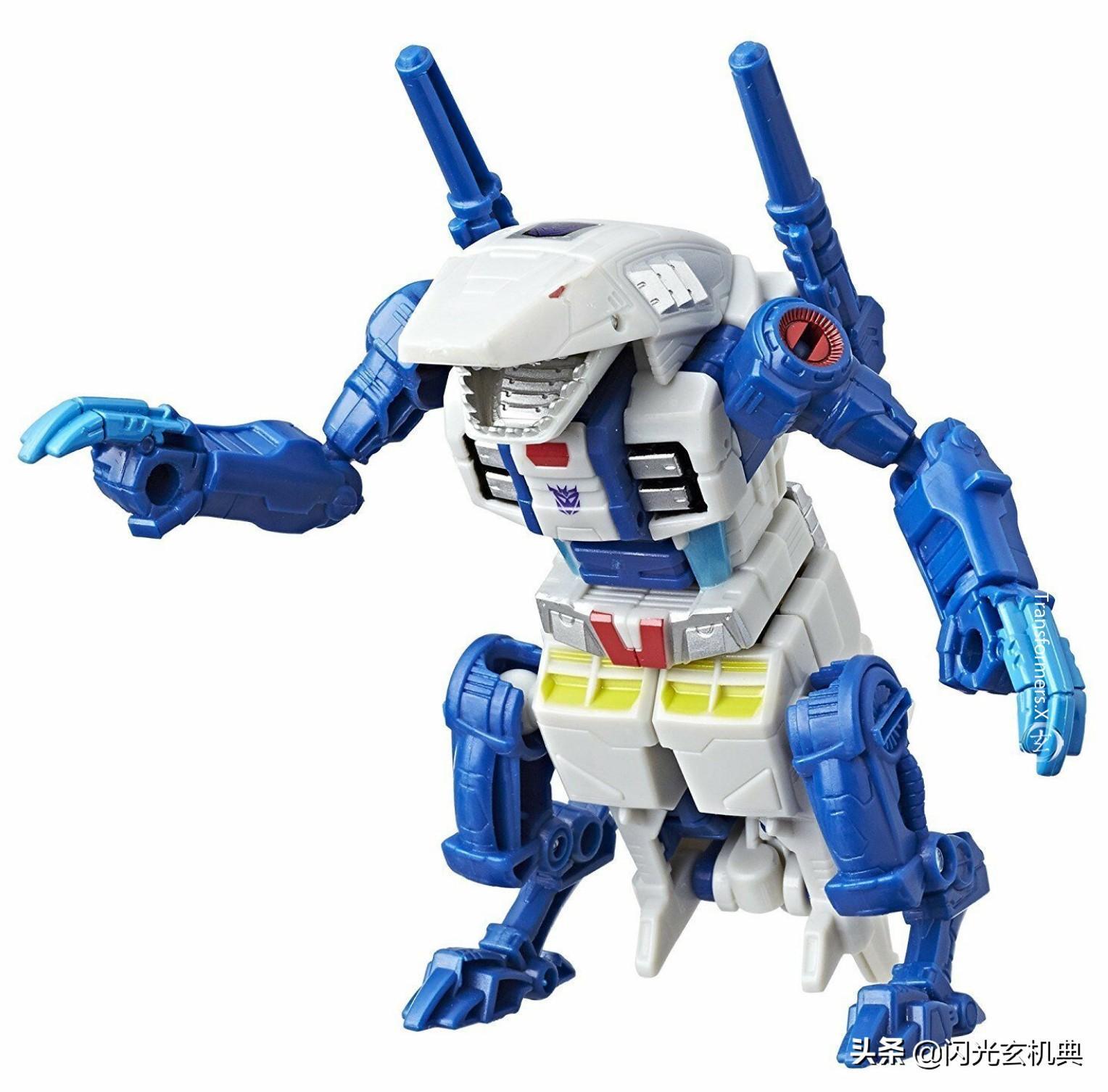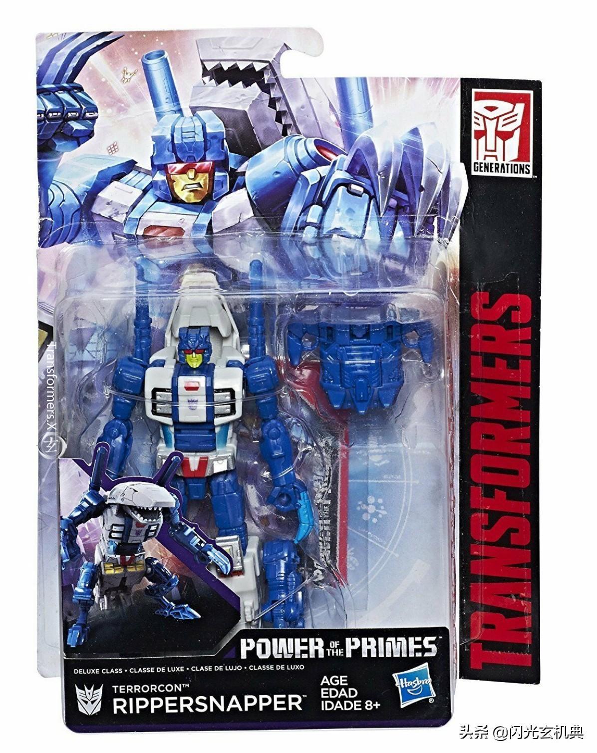 变形金刚Power of the Primes系列故事线背景之下的狂派霸天虎碎尸鲨的设计造型对照的玩具模型欣赏。
