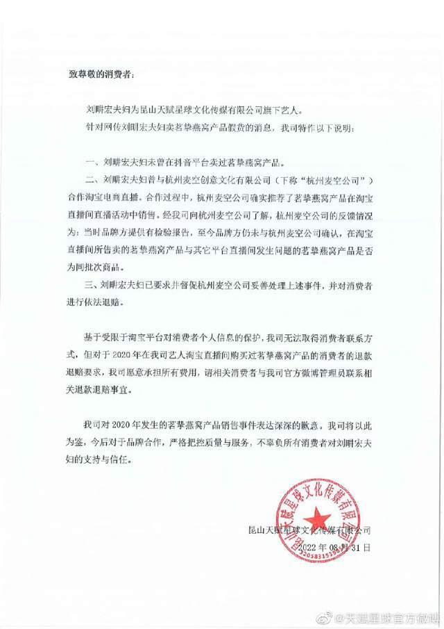 同日,天赋星球官微发布致歉声明称,旗下艺人刘畊宏夫妇曾与杭州麦空创意文化有限公司合作淘宝电商直播。合作过程中,杭州麦空公司确实推荐了茗挚燕窝产品在淘宝直播间直播活动中销售。经向杭州麦空公司了解,杭州麦空公司的反馈情况为:当时品牌方提供有检验报告,至今品牌方仍未与杭州麦空公司确认,在淘宝直播间所售卖的茗挚燕窝产品与其它平台直播间发生问题的茗挚燕窝产品是否为同批次商品。